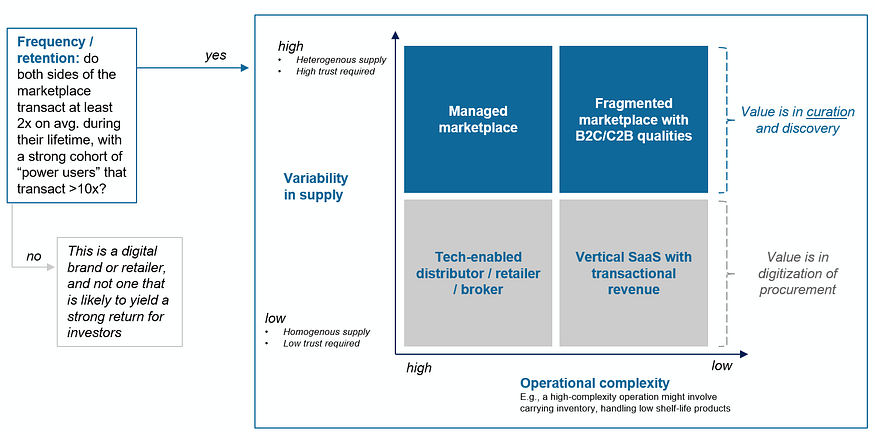 Variability of supply: an important axis when evaluating a B2B business model is whether there is a high degree of heterogeneity on the supply side, and therefore the platform can provide the functions of providing curation, discovery, and trust to the transaction. In cases where this is true, the business model is a “marketplace.” In cases where this is not true, and the supply-side is commoditized, the platform’s main function is to digitize a procurement process and move the same transaction that would have happened in an analog manner to a digital process.